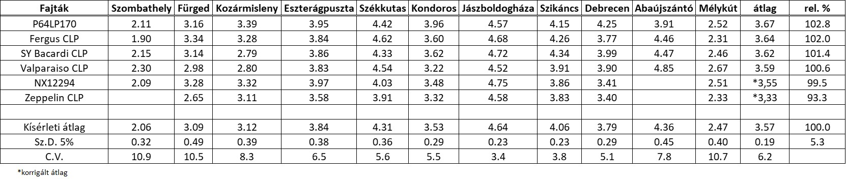 1.táblázat: NÉBIH napraforgó kisparcellás fajtaösszehasonlító kísérleti eredmények, 2024, V/4 CLHA PLUS középérésű kezelt csoport (kaszattermés, t/ha)